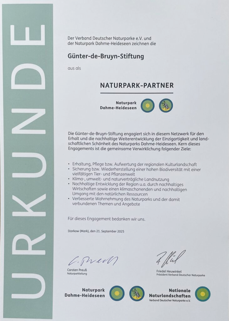 21. September 2025 – Auszeichnung „Naturpark-Partner“ des Naturparks Dahme-Heideseen an die Günter-de-Bruyn-Stiftung verliehen