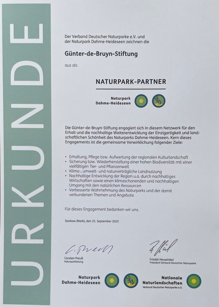 Auszeichnung „Naturpark-Partner“ des Naturparks Dahme-Heideseen an die Günter-de-Bruyn-Stiftung verliehen