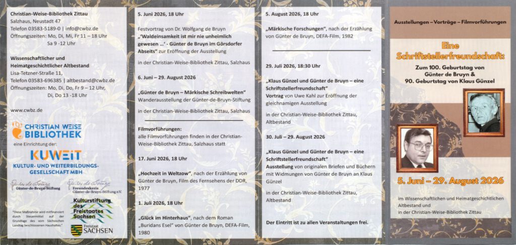 Eröffnung am 5. Juni, 18 Uhr mit der Ausstellung „Günter de Bruyn – Märkische Schreibwelten“. Vorträge, Filmvorführungen und eine Sonderausstellung im Altbestand.