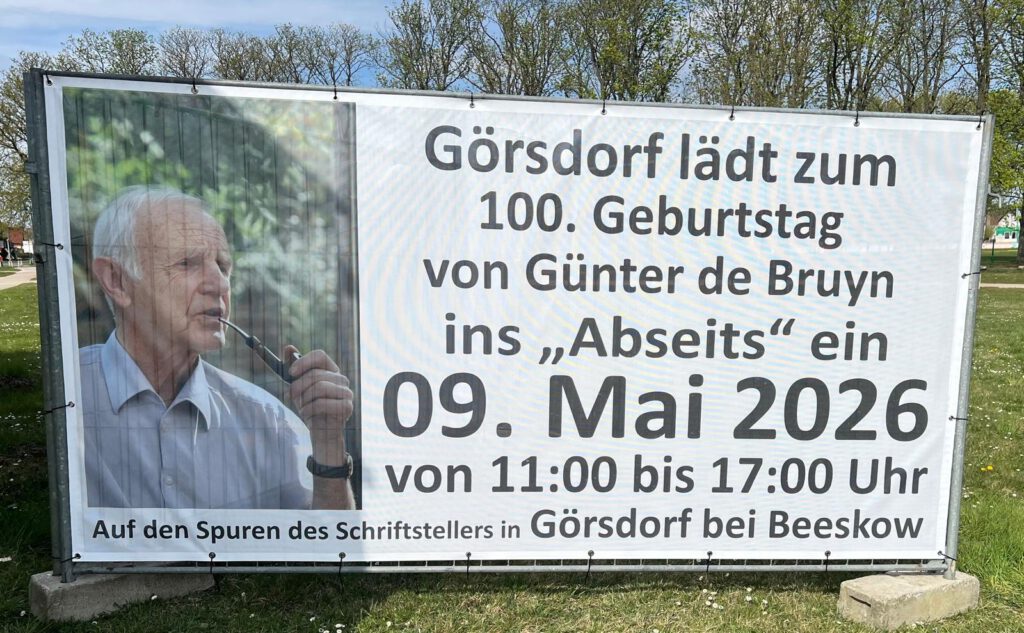 Görsdorf b. Beeskow lädt zum 100. Geburtstag von Günter de Bruyn ins „Abseits“ ein. Straße des Friedens 24, auf der Festwiese u.a. mit Lesungen, geführten Wanderungen zur Alten Schäferei nach Blabber, Musik
